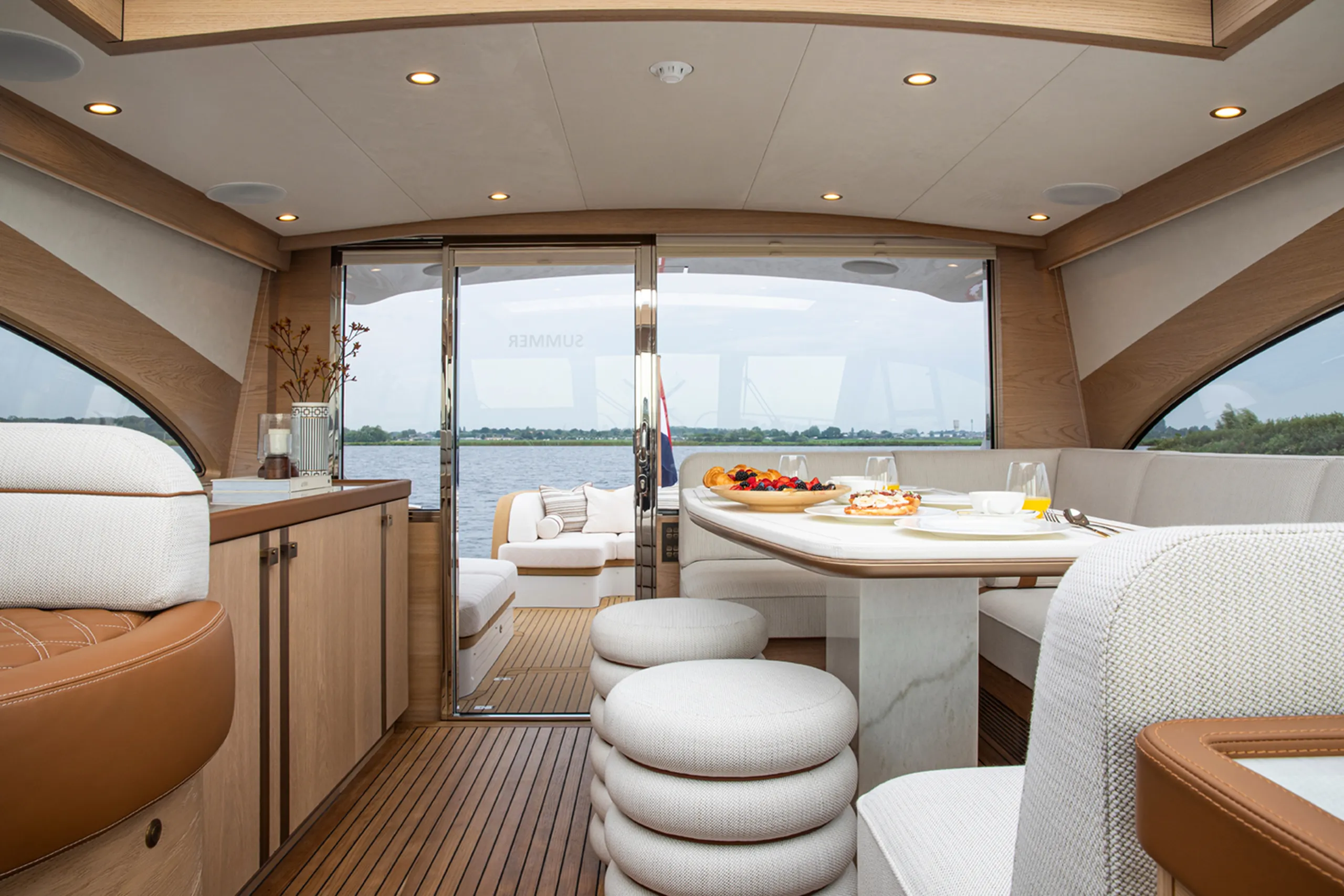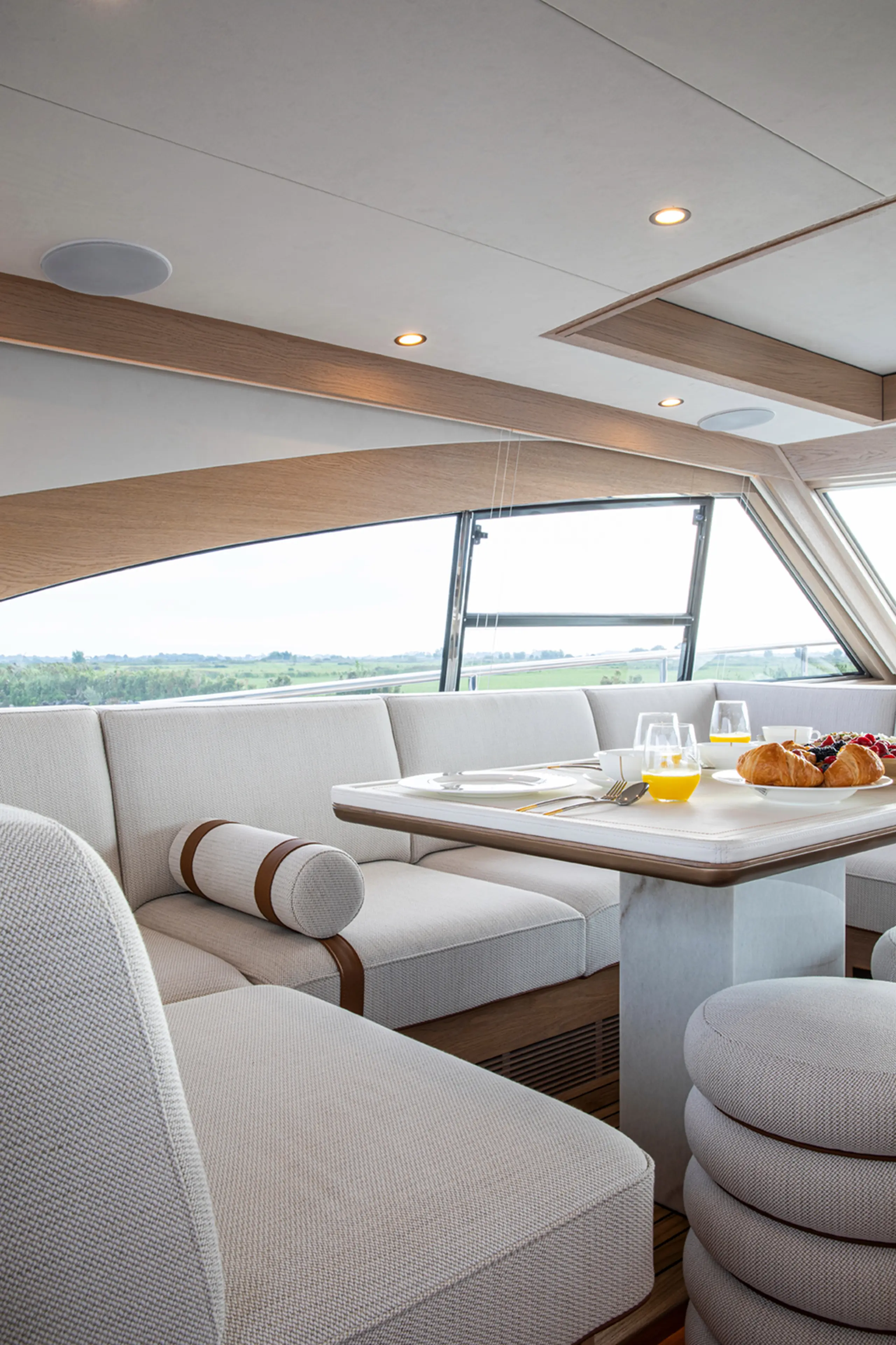 The snow-white hull and crystal silver metallic superstructure set the tone for an interior defined by nuance and restraint. A neutral palette forms the foundation for a rich composition of marble, bronze, eggshell, fine wood, leather, and tactile fabrics, all layered with the utmost precision. Subtle stitching in white and burnt orange adds rhythm and refinement.